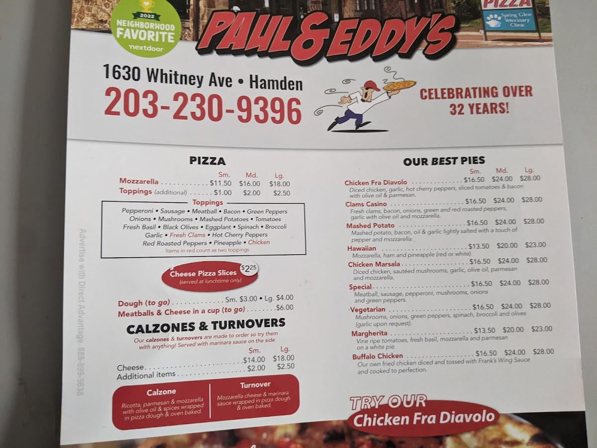 Welcome to Paul & Eddy's Pizza, nestled in the heart of Hamden, CT. This cozy pizzeria serves up an array of delicious offerings that have garnered a loyal local following. Whether you're craving classic pizza slices starting at just US$2.50 or a hearty medium mozzarella pie for US$17.00, there's something to satisfy every palate.